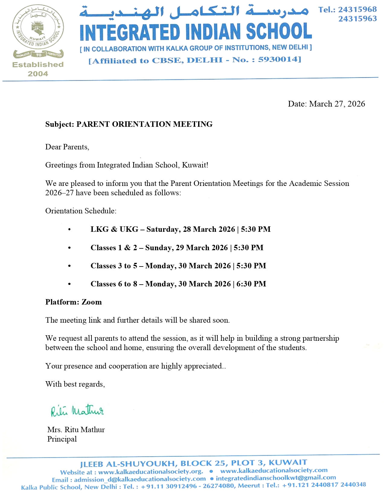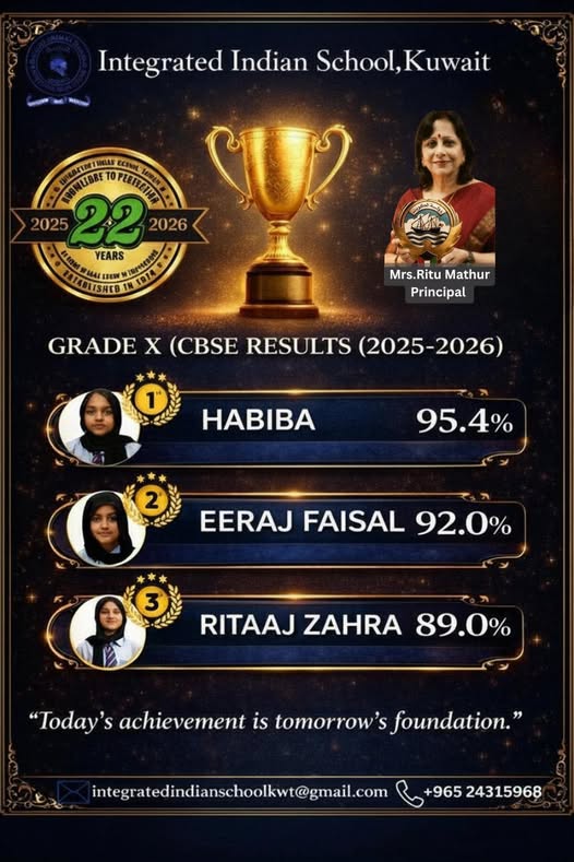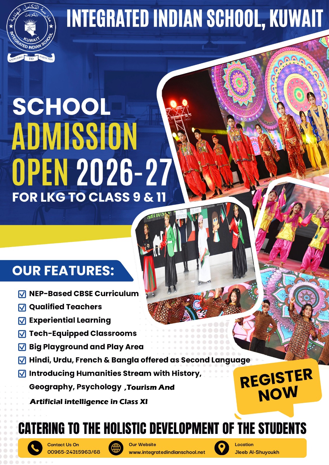 The Integrated Indian School, Jleeb-Al-Shuyoukh, Kuwait is a recognized school by the Ministry of Education, Kuwait. It is affiliated to Central Board of Secondary Education, New Delhi, India. The school was started in April 2004, and within a short period of time, has reached great heights. It is a co-educational, English medium, Senior Secondary School offering courses in Science and Commerce. The School as per its motto strives for the best in education.